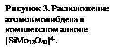 ] – молибдокремниевая кислота (МКК). Число атомов молибден, приходящихся на один атом кремния, равно 12. Комплексные соединения такого типа объединяют под названием насыщенные. Отношение 1:12 является верхней границей, которая нарушается только в исключительных случаях. Существует целый ряд ненасыщенных ГПС, где это отношение равно 1:11, 1:10, 1:9, 1:8 и т.д. Продукты 12, 9 и 6-го рядов наиболее многочисленны.