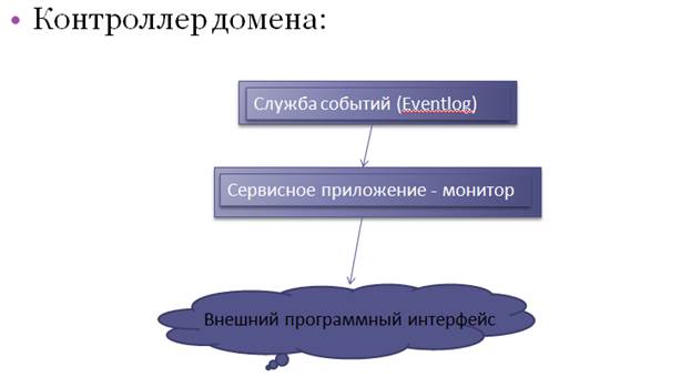 Разрабатываемое программное служит для воссоздания модели структуры каталога Active Directory. Это сервисное приложение, функционирующее на контроллере домена, осуществляющее мониторинг каталога Active Directory. Данная реализация мониторинга подразумевает использование службы журналирования Windows. По мере поступления информации об изменениях в каталоге, сервисное приложение осуществляет синхронизацию воссоздаваемой модели посредством передачи данных через внешний программный интерфейс (Рис 2).