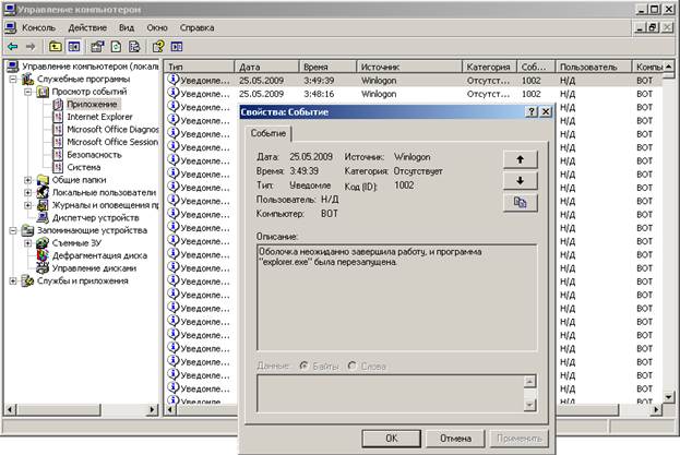 В стандартном наборе служб ОС Windows существует служба журналирования – EventLog. Она предоставляет возможность различными приложениям документировать события, происходящие в ходе их работы. Например, служба Winlogon оповещает о аварийном завершении процесса explorer (проводник), записывая данное событие в журнал «Приложения» (Рис 4).