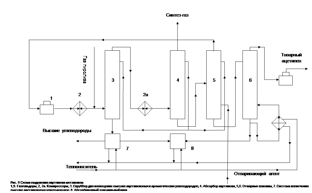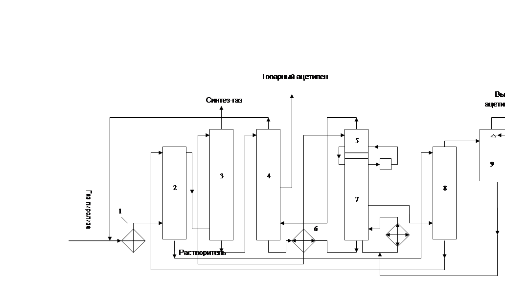 Выходящие из системы газовые потоки – синтез – газ, товарный ацетилен и высшие гомологи ацетилена промываются в соответствующих скрубберах водой для улавливания паров абсорбента (N – метилпирролидона), содержащегося в этих газовых потоках. Водные растворы абсорбента возвращаются в систему циркуляции абсорбента и, в частности, в кипятильник вакуумной колонны 7. Для рассмотренной схемы характерны многоступенчатая абсорбция и десорбция, а также использование выходящих с верха десорберов газовых потоков для отпарки менее растворимых компонентов. Благодаря этому достигается высокая степень извлечения и чистота ацетилена и сниджаются энергетические затраты. Получаемый ацетилен имеет чистоту 99,5 %.