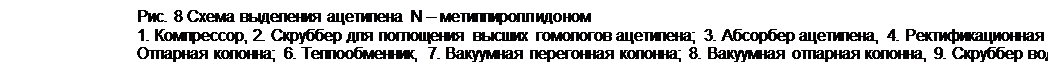 С, поток паров проходит вверх по колонне, отпаривая отабсорбента высшие гомологи ацетилена. Регенерированный абсорбент охлаждается в теплообменнике 6 и поступает на орошение абсорбера 3. Газ из верхней части колонны 7 подается в нижнюю часть колонны 5 для отпарки ацетилена. Из средней части колонны 7 в виде бокового погона отбирается поток паров, содержащих гомологи ацетилена, который поступает в низ вакуумной отпарной колонны 8, орошаемой абсорбентом, насыщенным гомологами ацетилена, из абсорбера 2. В вакуумной отпарной колонне 8 десорбируются высшие гомологи ацетилена, а регенерированный абсорбент возвращается на орошение абсорбера 2.