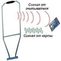 . Электрический ток, индуцированный в антенне электромагнитным сигналом от считывателя, обеспечивает достаточную мощность для функционирования кремниевого чипа, размещённого в метке, и передачи ответного сигнала.(Коммерческие реализации низкочастотных RFID-меток могут быть встроены в стикер (наклейку) или имплантированы под кожу.)