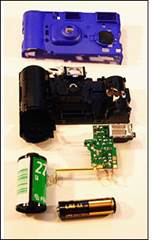 - Устройство можно собрать из деталей одноразовой фотокамеры. На место вспышки в камере приделывается катушка индуктивности, подключенная одним концом к конденсатору, другим к выключателю, который, в свою очередь, подключен к другому концу конденсатора. При включении катушка индуктивности создаёт мощную электромагнитную волну. Электромагнитное поле возбуждает ток внутри чипа, который при высоких значениях может разрушить чип.