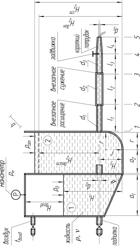 , а значит, напор в резервуаре 1 также постоянен. Движение жидкости установившееся, расход, истекающий из установки, равен расходу, восполняемому подпиткой. Этот расход, как принято, обозначаем буквой Q