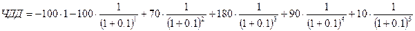 Предприятие определяет возможность производства новой продукции. Для запуска проекта необходимо затратить в начальный момент времени 100 т. руб. на организацию производства, через год - 100 т. руб. на рекламу. Во второй, третий, четвертый и пятый годы реализация новой продукции приносит прибыль: 70 т. руб., 180 т. руб., 90 т. руб. и 10 т. руб. соответственно. Определить ЧДД при Е=0,1.