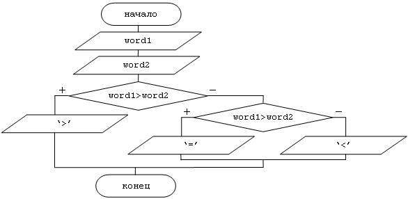 Program slovo; Var word1, word2: string[60]; Begin readln(word1); readln(word2); if word1 > word2 then writeln ('>') else begin if word1 = word2 then writeln ('=') else writeln ('<'); End.