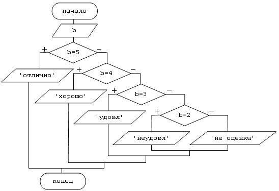 Конструкция выбор. Ситуации, реализующие систему вложенных ветвлений могут быть разрешены с использованием конструкции выбор. Оператор выбора является структурированным и использует в своей записи операторы case, of, else, end и операторные скобки по необходимости. В самом общем виде оператор выбора можно записать так: Case порядковая переменная of значение1: begin оператор1; оператор2; …; операторN; end; значение2: begin оператор1; оператор2; …; операторN; end; … значениеM: begin оператор1; оператор2; …; операторN; end; else begin оператор1; оператор2; …; операторN; end; end; Пример: ввести оценку студента в баллах и сообщить ее название. Begin Read(b) Case b of 5: Write('отлично'); 4: Write('хорошо'); 3: Write('удовл.'); 2: Write('неудовл.'); else Write('это не оценка'); end; End. Порядковая переменная, значение которой при выполнении программы определяет ветвь в операторе выбора, подлежащую выполнению, может принадлежать любому целочисленному типу. В случае, когда для нескольких значений выполняемые действия одинаковы, их можно указать один раз, а сами значения перечислить через запятую. Пример: напечатать количество дней во введенном месяце: Begin Read(m); Case m of янв, мар, май, июл, авг, окт, дек: Write('31'); апр, июн, сен, ноя: Write('30'); фев: Write('28'); else Write ('это не месяц'); end; End.
