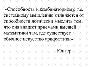 Немецкий писатель и мыслитель Юнгер писал: «Способность к комбинаторному, т.е. системному мышлению отличается от способности логически мыслить тем, что она владеет приемами высшей математики там, где существует обычное искусство арифметики».