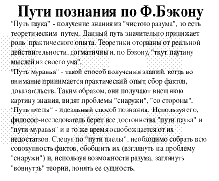 «Путь пчелы», по Бэкону, – идеальный способ познания. Используя его, философ-исследователь берет все достоинства «пути паука» и «пути муравья» и в то же время освобождается от их недостатков. Следуя по «пути пчелы», необходимо собрать всю совокупность фактов, обобщить их и, используя возможности разума, заглянуть «вовнутрь» теории, понять ее сущность.