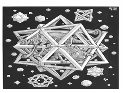 Я была приятно удивлена, увидев в вашей замечательной гимназии уголок с картинами моего любимого художника Мориса Эшера. Я предлагаю вам еще одно его произведение «Три мира». Подумайте, в контексте сегодняшнего урока, какие три мира изображены здесь и какие пути познания предлагает художник для их изучения.