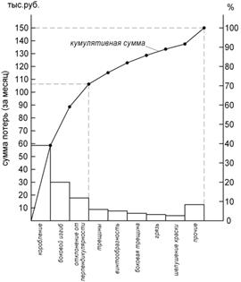 С помощью столбчатого графика представляют количественную зависимость, выражаемую высотой столбика, таких факторов, как себестоимость изделия от вида изделия, сумма потерь в результате брака от процесса, коэффициент вклада в возникновение пожара от рабочего участка, сумма выручки от магазина и т. д. Разновидности столбчатого графика - диаграмма Парето и гистограмма. При построении столбчатого графика по оси ординат откладывают количество, по оси абсцисс - факторы; каждому фактору соответствует столбик.