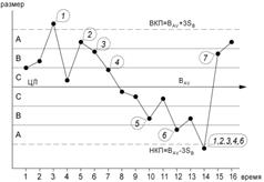 . При появлении на контрольной карте сигнала о нарушении уровня настройки или разброса процесс останавливают и производят его регулировку (например, поднастраивают или заменяют инструмент).