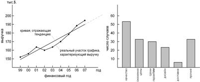 Пример столбчатого графика показан на рисунке 10б. С помощью этого графика анализируются стимулы к покупке изделий. При первом взгляде на график становится ясным коэффициент вклада в решение о покупке каждого из стимулов. Столбики, выражающие стимулы, расположены на графике в порядке их частоты.