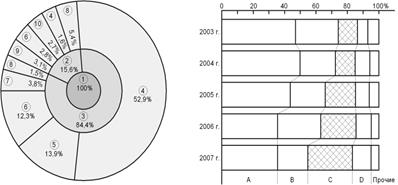 Пример ленточного графика для выражения соотношения сумм выручки от продажи изделий по отдельным видам изделий показан на рисунке 11б, где A, B, C и D – различные виды изделий.