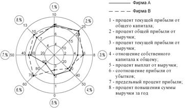 Построение производится следующим образом: из центра круга к окружности проводятся по числу факторов прямые линии (радиусы). На эти радиусы наносят деления градуировки и откладывают значения данных. Точки, которыми обозначены отложенные значения, соединяют отрезками прямой. Числовые значения, относящиеся к каждому из факторов, сравнивают со значениями, достигнутыми другими фирмами. Поскольку график отличается высокой наглядностью, его используют для анализа управления предприятием, для оценки кадров, для оценки качества и т. д.