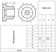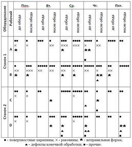 (рисунок 2), который выполнен таким образом, что из него можно выбрать необходимую информацию о дефектах, допущенных не только по вине рабочего или по причине плохой наладки станка, но и определить появление брака, вызванное усталостью рабочего во второй половине дня или изменением условий его работы;