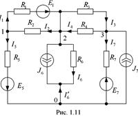 Для электрической цепи (рисунок 1.1) по заданным значениям сопротивлений и ЭДС определить эквивалентное сопротивление цепи относительно зажимов источника питания, распределение токов по ветвям и падения напряжений во всех ветвях цепи.