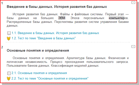 – это набор тематический разделов, в которых размещены ресурсы и активные элементы курса.