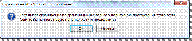 Если тест имеет ограничение по времени или/и количество попыток ограничено, то система выдаст предупреждение: