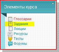 является инструментом формирования и проверки профессиональных навыков и умений, обозначенных в типовой рабочей учебной программе по дисциплине. Чтобы воспользоваться данным инструментом, Вам необходимо перейти к инструменту «Задания». Это можно сделать из блока «Элементы курса» или из меню курса, выбрав необходимый пункт меню (рис. 21).