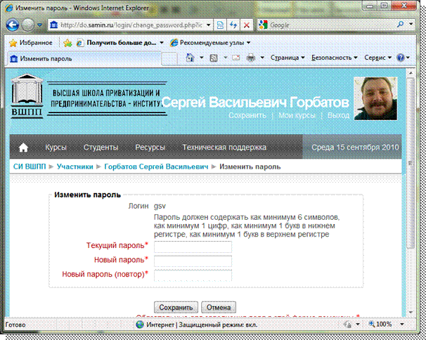После входа в свой профиль, в целях укрепления безопасности измените пароль, полученный Вами в деканате, на новый, уникальный, известный только Вам пароль. Для этого нажмите на кнопку «Изменить пароль». Вы попадете на форму изменения пароля пользователя (Рисунок 4).