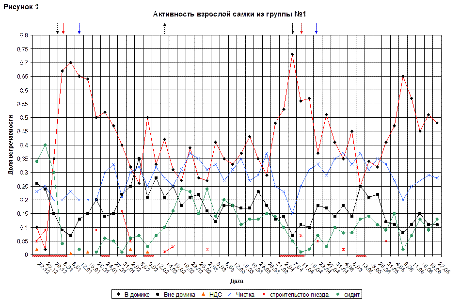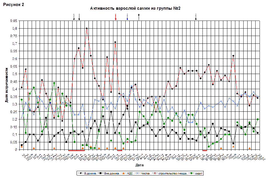 Доля обнюхиваний колебалась не сильно. Максимально она составляла 0,03 и пришлась на 38(110)дней.