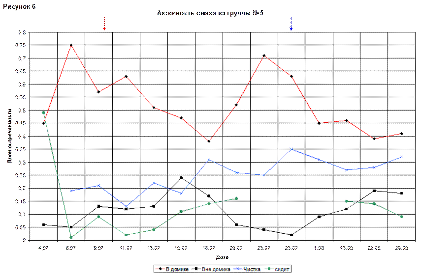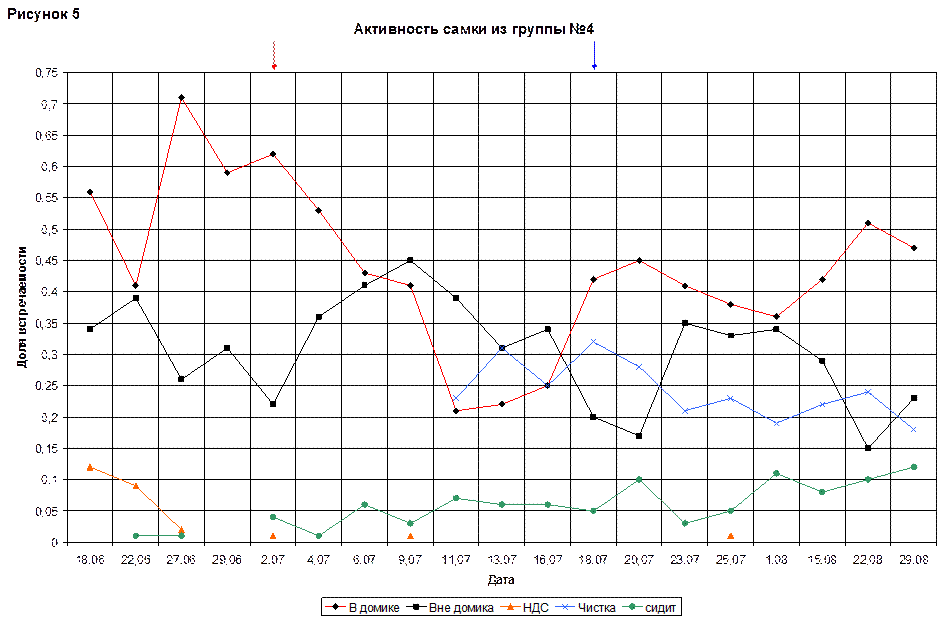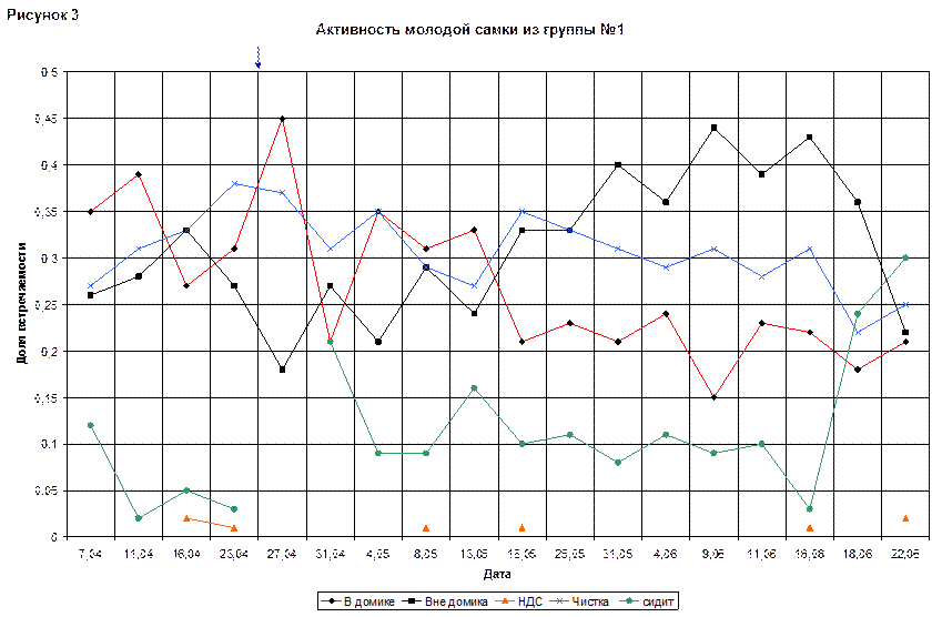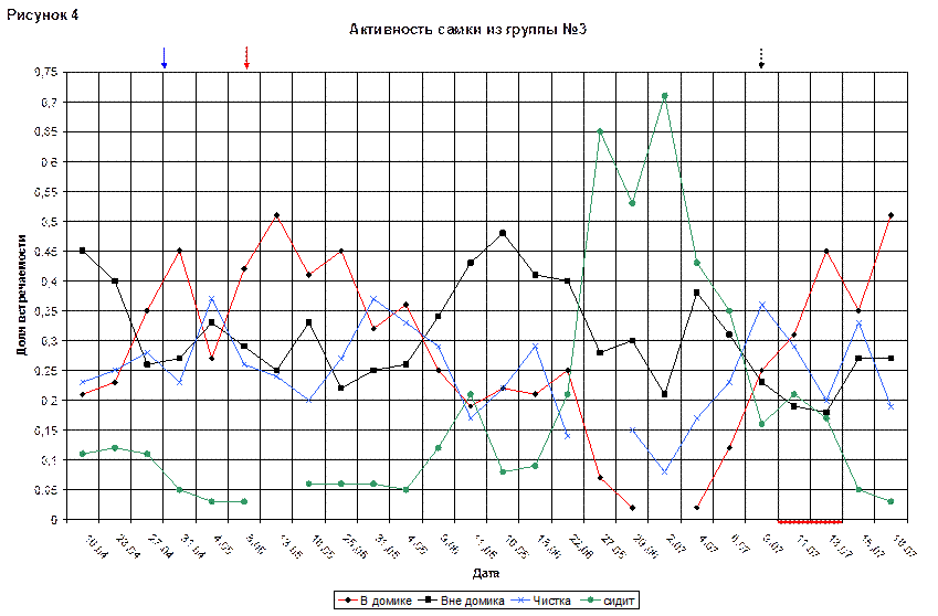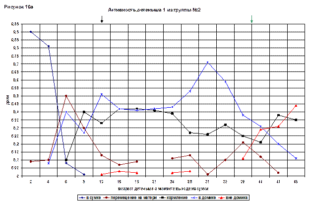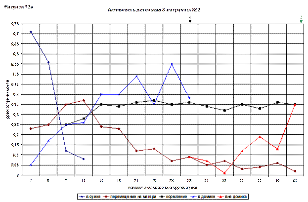 Время, которое детеныш проводил в домике, постепенно росло, в 25(97) дней достигло максимума – 0,55. Но с 25(97) дней молодую самку можно было увидеть в домике только в период кормления. В общем, линия «кормление» на протяжении всего периода меняется не сильно. На конец наблюдений её доля составляла 0,35.