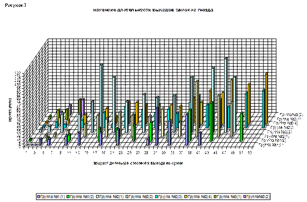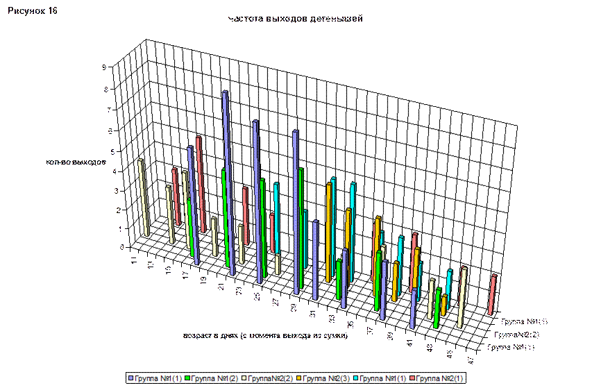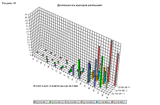 Сравнивая две гистограммы (рис 15 и рис 16), можно проследить зависимость частоты выходов от их длительности. На первом этапе, выходы были не продолжительными, но частыми. Примерно у всех детенышей длительность пребывания вне домика, начинала расти через 33 дня после выхода из сумки. Самые продолжительные выходы были зафиксированы у самки 1 из группы №2. Меньше всего времени вне домика проводили самки из второго выводка (группа №2). У самцов длительность выхода не сильно отличалась, но детеныш 1 начал выходить из гнезда раньше, и частота его выходов выше, чем у остальных детенышей.