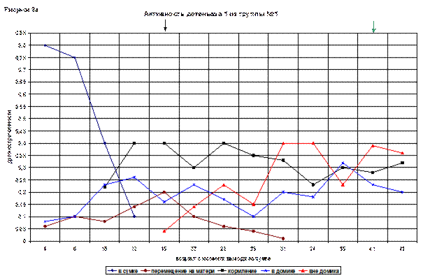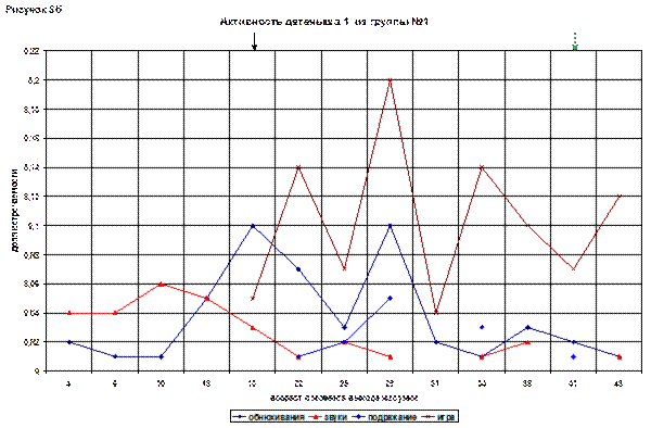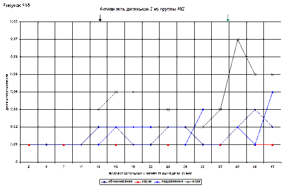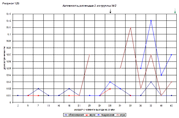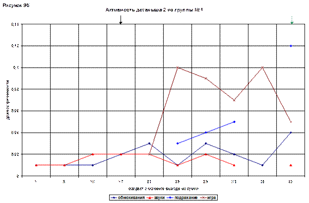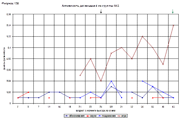 На графике привлекает внимание линия игрового поведения. Она сразу начинается с довольно высокого показателя (0,05), в возрасте 21(93) и дальше постепенно растет. В 43(115) дня достигает максимума – 0,14.