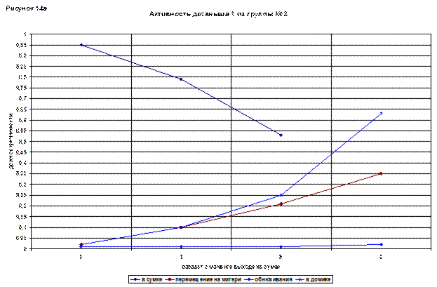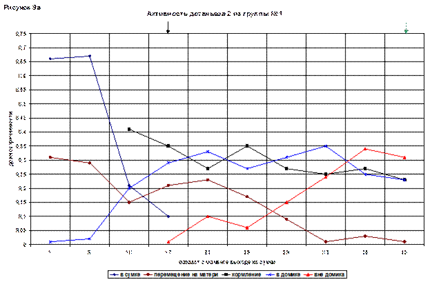 Перемещение на матери впервые было зафиксировано в 3(75) дня и составило 0,12, затем время постепенно росло и достигло 0,26 в последний день наблюдений. Доля обнюхиваний не превышала 0,01.