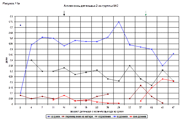 Начиная с первых дней, постепенно росло время, проводимое детенышем в домике. На 33 (105) день был отмечен максимум – 0,54, затем линия поползла вниз. В 43(115) дня она составляла 0,35.
