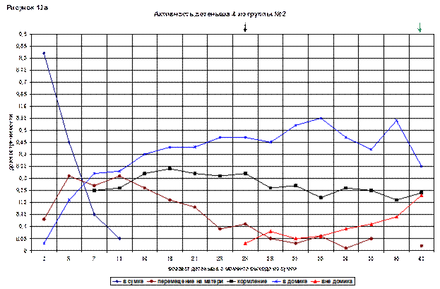 Регистрация поведения детеныша, началась с 2(74) дневного возраста (2 апреля) (рис 12а,12б) Время нахождения в сумке стремительно падало (с 0,71 в первый день наблюдений до 0,08 на четвертый).
