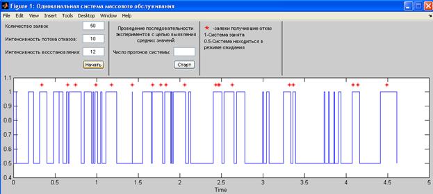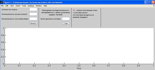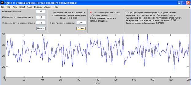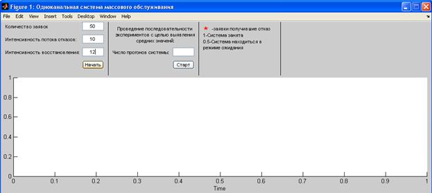 Для запуска программы необходимо в командном окне системы MATLAB ввести имя М-файла : smo. В результате должно появиться окно, представленное на рисунке 1. Для запуска имитационной модели необходимо заполнить 3 левых поля и нажать на кнопку начать, как это показано на рисунке 2.