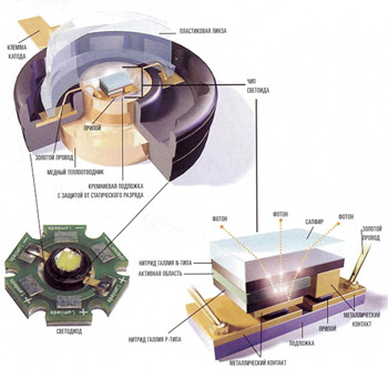 Светодиод или светоизлучающий диод - полупроводниковый прибор, излучающий некогерентный свет при пропускании через него электрического тока. Излучаемый свет лежит в узком участке спектра, его цветовые характеристики зависят от химического состава использованного в светодиоде полупроводника.