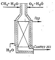 Это – пустотелый аппарат, рассчитанный на высокое давление. Конвертор имеет внутреннюю изоляцию и водяную рубашку, предохраняющую корпус от действия высоких температур, а также смеситель углеводорода и кислорода, обеспечивающий быструю гомогенизацию смеси во взрывобезопасных условиях. Достоинствами процесса являются его высокая интенсивность, простота конструкции конвертора, отсутствие катализатора и нетребовательность к качеству исходного сырья. Это обуславливает все более широкое распространение высокотемпературной конверсии особенно для жидких углеводородов (вплоть до мазута и сырой нефти), которую оформляют в виде энерготехнологических схем с агрегатами большой единичной мощности.