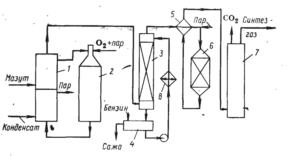 Подогретый мазут вводят через форсунки в смеситель конвертора 2, куда подают смесь кислорода с водяным паром. В рубашке конвертора, необходимой для охлаждения его корпуса, генерируется пар того же давления, при котором проводится конверсия. Горячие газы конверсии поступают в блок 1 рекуперации тепла. Затем из газов выделяют сажу, для чего большей частью промывают их циркулирующей водой в скруббере 3. Вода с сажей стекает в отстойник 4, куда добавляют легкую нефтяную фракцию, способную к коагуляции и извлечению сажи из водного слоя. Углеводородную суспензию сажи используют по-разному: отфильтровывают и сжигают, возвращая нефтяную фракцию на извлечение сажи, а в других случаях направляют в виде суспензии в мазуте на конверсию. Загрязненную воду из отстойника 4 возвращают на улавливание сажи в скруббер 3.