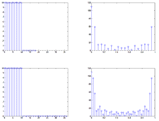 Рис.3 Повышение спектрального разрешения ДПФ при дополнении сигнала нулями: сверху - исходный сигнал и модуль его ДПФ, снизу - сигнал, дополненный 18 нулями, и модуль его ДПФ.