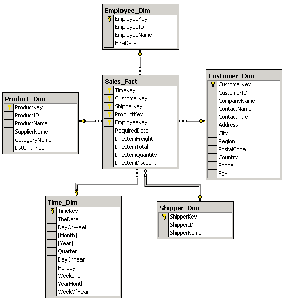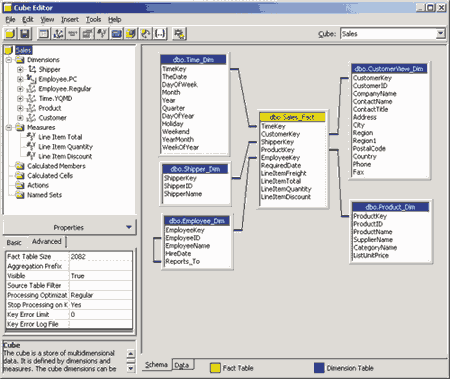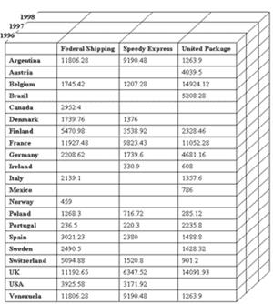 Рассмотрим подробнее концепцию OLAP и многомерных кубов. В качестве примера реляционной базы данных, который мы будем использовать для иллюстрации принципов OLAP, воспользуемся базой данных Northwind, входящей в комплекты поставки Microsoft Access и представляющей собой типичную базу данных, хранящую сведения о торговых операциях компании, занимающейся оптовыми поставками продовольствия. К таким данным относятся сведения о поставщиках, клиентах, компаниях, осуществляющих доставку, список поставляемых товаров и их категорий, данные о заказах и заказанных товарах, список сотрудников компании. Подробное описание базы данных Northwind можно найти в справочных системах Microsoft SQL Server или Microsoft Access — здесь за недостатком места мы его не приводим.