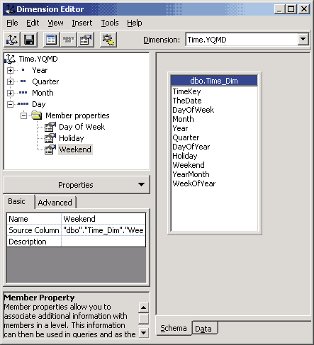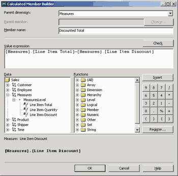 Для создания вычисляемых выражений следует выбрать раздел Calculated Members и из контекстного меню выбрать опцию New Сalculated Member. После этого будет запущен построитель выражений (Calculated Member Builder), в котором можно создавать и редактировать выражения, перетаскивая мышью имена измерений и их уровней, мер, имена функций. Например, перенесем в поле для выражения имена мер [Measures].[Line Item Total] и [Measures].[Line Item Discount], поставим между ними знак вычитания, а в качестве значения Member Name ведем Discounted Total.