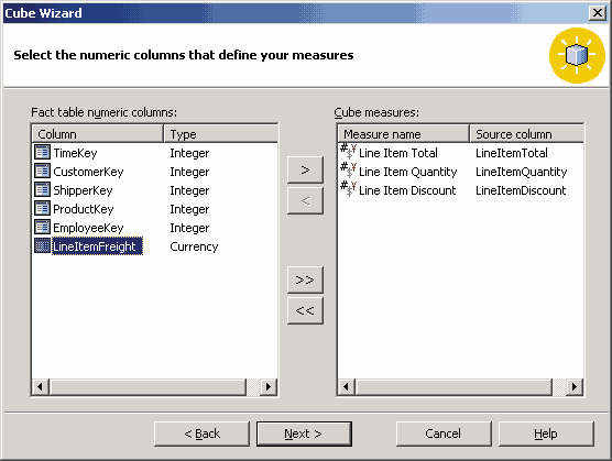 Первое, что следует сделать после запуска мастера, — выбрать таблицу фактов для будущего куба. В нашем случае это таблица Sales_Fact. Далее из таблицы фактов следует выбрать одно или несколько полей, на основе которых вычисляются меры куба (то есть поля, данные которых подлежат суммированию либо обработке с помощью других агрегатных функций). Выберем поля Line Item Total, Line Item Quantity и Line Item Discount.