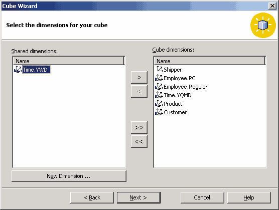 Следующим шагом будет выбор коллективных измерений, используемых в этом кубе, а также создание недостающих частных измерений. Выберем коллективные измерения Employee.PC, Employee.Regular, Time.YQMD, Product и Customer. Кроме того, добавим новое измерение Shipper, нажав кнопку New Dimension в диалоговой панели выбора измерений. Это приведет к запуску уже знакомого нам мастера создания измерений; в последней из диалоговых панелей мастера в этом случае мы можем выбрать, каким будет создаваемое измерение — частным или коллективным.