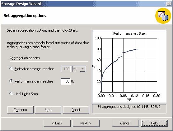 Еще один вопрос, который следует решить при создании многомерного хранилища данных — сколько агрегатов следует хранить? Агрегаты — это заранее вычисленные агрегатные данные, соответствующие ячейкам куба. Чем их больше, тем быстрее выполняются запросы к многомерному хранилищу и тем больше объем самого хранилища. Поэтому в общем случае требуется некое их количество, позволяющее осуществить разумный баланс между компактностью и производительностью. Для определения количества агрегатов и их вычисления следует запустить Storage Design wizard — мастер создания многомерного хранилища. Для этого в редакторе кубов следует выбрать пункт меню Tools | Design Storage. В первой диалоговой панели следует указать способ хранения данных — MOLAP, ROLAP или HOLAP (в нашем примере мы выберем MOLAP). Затем выбрать, какова должна быть производительность при выполнении запросов (либо будущий максимальный объем хранилища). После этого можно нажать на кнопку Start и получить зависимость производительности от объема хранилища.