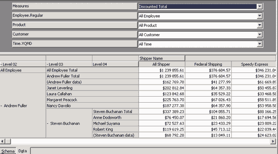 Если в сводной таблице оставить только одну меру, перенеся оставшиеся обратно на панель инструментов PivotTables, измерение Data исчезнет. Отметим, что с помощью одного из доступных в Excel шаблонов оформления можно изменить оформление сводной таблицы. Кроме того, можно выбрать на панели инструментов PivotTables пункты меню PivotTable | Table Options или PivotTable | Field Settings и изменить другие параметры отображения данных в сводной таблице. Применяя Excel в качестве OLAP-клиента, следует помнить, что объем данных, отображаемых в сводной таблице, ограничен — ведь все эти данные хранятся в оперативной памяти клиентского компьютера.