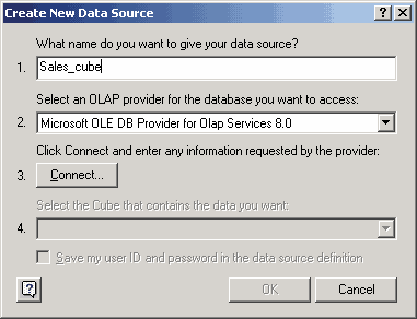 В процессе создания источника данных укажем его имя, выберем OLE DB-провайдер (в нашем случае — Microsoft OLE DB Provider for OLAP Services 8.0, поскольку мы используем Microsoft SQL Server 2000 Analysis Services) и нажмем на кнопку Connect.