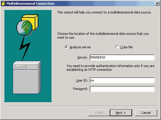В диалоговой панели Multidimensional Connection укажем имя компьютера (если это локальный компьютер, можно использовать имя localhost), на котором расположен OLAP-сервер, а также данные для аутентификации пользователя, которые понадобятся только в том случае, если для связи с OLAP-сервером мы используем HTTP-протокол.