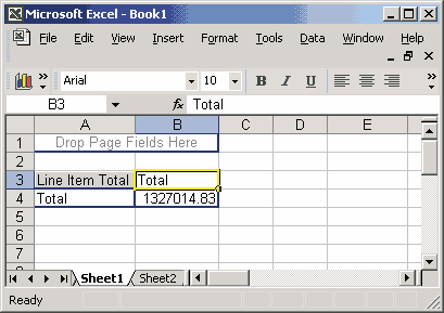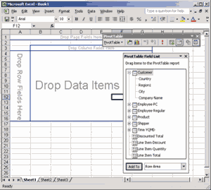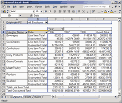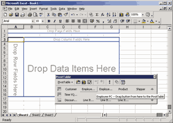 Для дальнейших манипуляций нам потребуется панель инструментов PivotTable. В случае с Excel 2000 пользоваться ею удобнее, если она не закреплена у края окна Excel, а свободно перемещается по экрану, в противном случае некоторые нужные нам элементы этой панели окажутся недоступны.