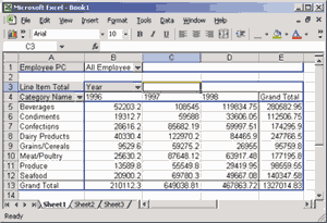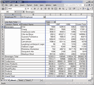 Выяснив, что представляют собой средства чтения OLAP-кубов Microsoft Office, мы можем перейти к более детальному рассмотрению процесса чтения и отображения OLAP-кубов с помощью Microsoft Excel. Как было отмечено выше, средства создания сводных таблиц Microsoft Excel хранят в кэше агрегатные данные, вычисленные на основе данных из реляционных СУБД или полученные от OLAP-серверов. Манипулируя сводной таблицей, пользователь может управлять отображением данных из этого кэша. Прежде чем приступить к созданию примера, заметим, что посредством Microsoft Excel 2000 можно корректно отображать данные из OLAP-кубов, созданных с помощью Microsoft SQL Server 7.0 OLAP Services. Что касается OLAP-кубов, созданных с помощью Microsoft SQL Server 2000 Analysis Services, по большей части посредством Microsoft Excel 2000, то они также отображаются корректно, однако имеются и некоторые ограничения. Например, при создании локальных кубов OLAP или при сохранении сводной таблицы в виде Web-страницы с помощью соответствующих мастеров автоматически выбирается OLE DB-провайдер предыдущей версии (версии 7.0), не поддерживающий несбалансированные измерения. Это приводит к сообщениям об ошибках и к игнорированию таких измерений или даже всего источника данных. При использовании же Microsoft Excel 2002 эти проблемы не возникают.
