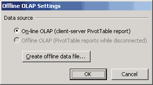 Чтобы создать локальный OLAP-куб на основе серверного куба, следует на панели инструментов PivotTables выбрать пункт меню PivotTable | Offline OLAP в Excel 2002 (в Excel 2000 ему соответствовал пункт меню PivotTable | Client-Server Settings) и нажать кнопку Create offline data file.