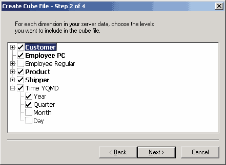 Далее следует выбрать измерения и их уровни, а также меры, которые будут присутствовать в локальном кубе.