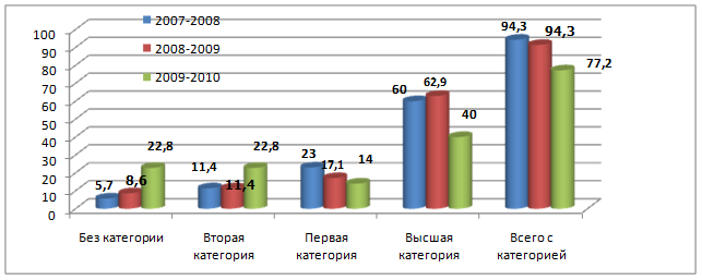 Количество учителей, имеющих категорию первую и высшую категории сократилось на % за счет увеличения количества молодых и вновь прибывших учителей, не имеющих категории.